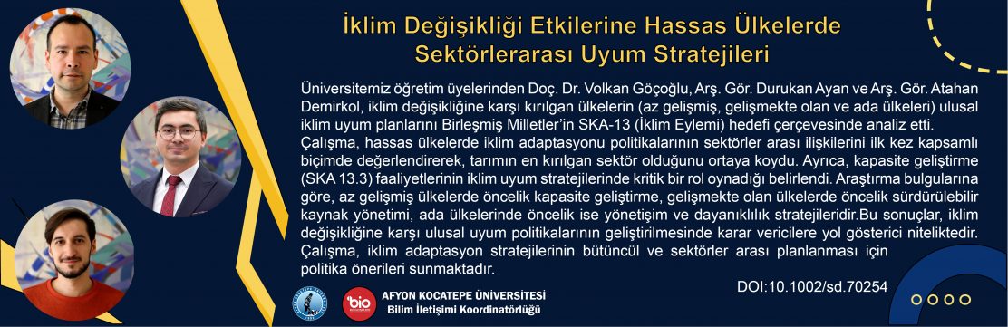 Fakültemiz SBKY bölümü öğretim üyesi Doç. Dr. Volkan Göçoğlu ile araştırma ekibinden Arş. Gör. Durukan Ayan ve Arş. Gör. Atahan Demirkol, iklim değişikliğine karşı kırılgan ülkelerin (az gelişmiş, gelişmekte olan ve ada ülkeleri) ulusal iklim uyum planlarını Birleşmiş Milletler’in “İklim Eylemi” (SKA-13) hedefi çerçevesinde analiz etmiştir.