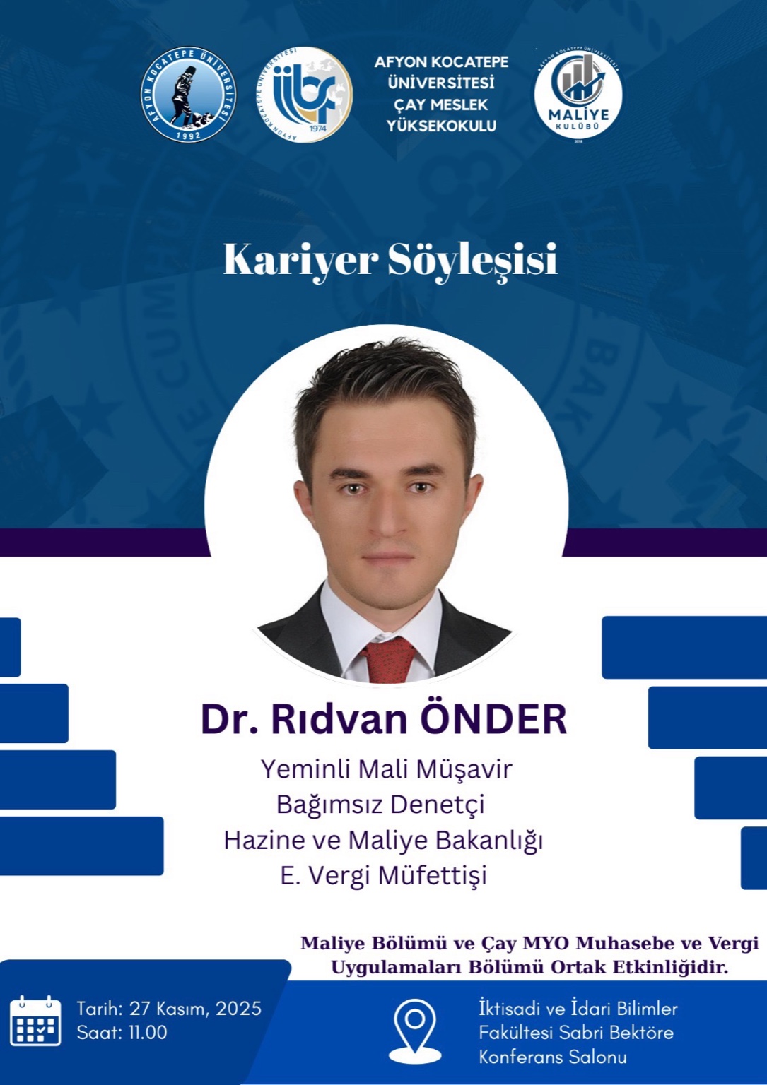Fakültemiz Maliye Bölümü ile Çay Meslek Yüksekokulu Muhasebe ve Vergi Uygulamaları Bölümü iş birliğinde, Dr. Rıdvan Önder’in konuk olacağı bir Kariyer Söyleşisi düzenlenecektir.