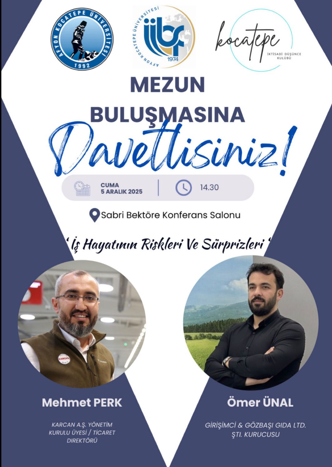 Fakültemiz ve Kocatepe İktisadi Düşünce Kulübü iş birliğinde, 2025 Mezun Buluşmaları kapsamında mezunlarımız Mehmet Perk (Karcan A.Ş. Yönetim Kurulu Üyesi / Ticaret Direktörü) ve Ömer Ünal (Girişimci & Gözbaşı Gıda Ltd. Şti. Kurucusu), öğrencilerimizle bir araya gelecektir.