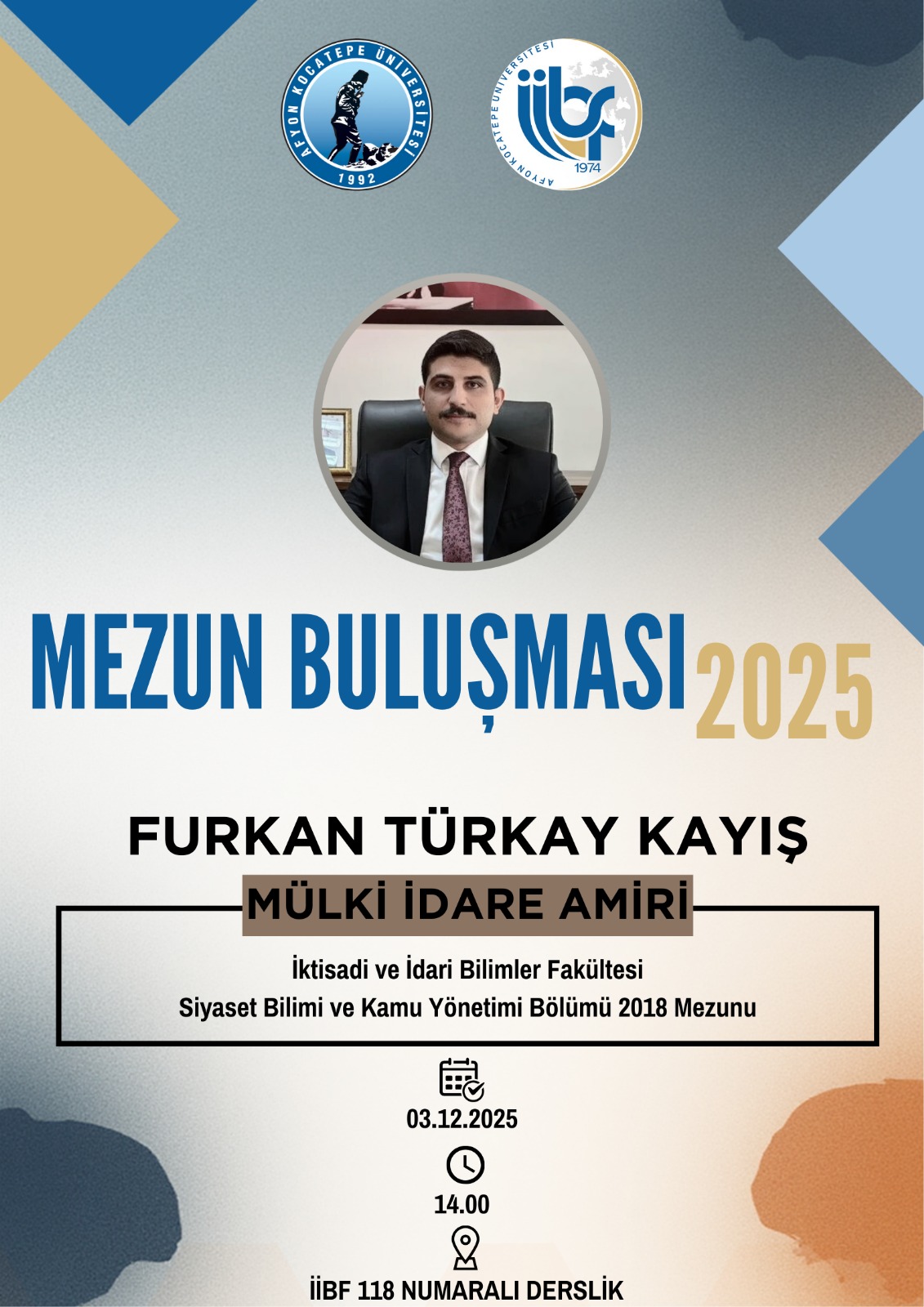 Fakültemiz tarafından “Mezun Buluşması 2025” etkinliği kapsamında, İİBF Siyaset Bilimi ve Kamu Yönetimi Bölümü 2018 mezunumuz ve Mülki İdare Amiri Furkan Türkay Kayış, öğrencilerimizle bir araya gelecektir.
