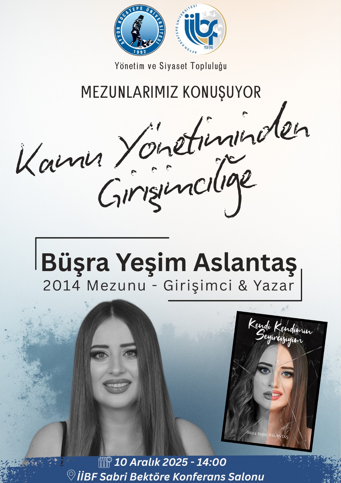 Fakültemiz ve Yönetim ve Siyaset Topluluğu iş birliği ile “Mezunlarımız Konuşuyor” etkinliği kapsamında, İİBF Kamu Yönetimi Bölümü 2014 mezunumuz ve girişimci-yazar Büşra Yeşim Aslantaş, öğrencilerimizle bir araya gelecektir.