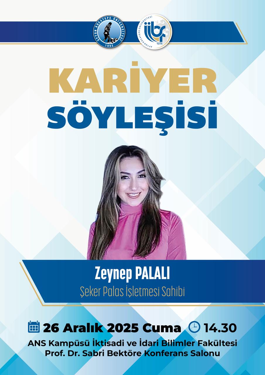 Fakültemiz Uluslararası Ticaret ve Finansman (UTF) bölümü tarafından düzenlenen “Kariyer Söyleşisi” kapsamında, Şeker Palas İşletme Sahibi Zeynep Palalı öğrencilerimizle bir araya gelecektir.